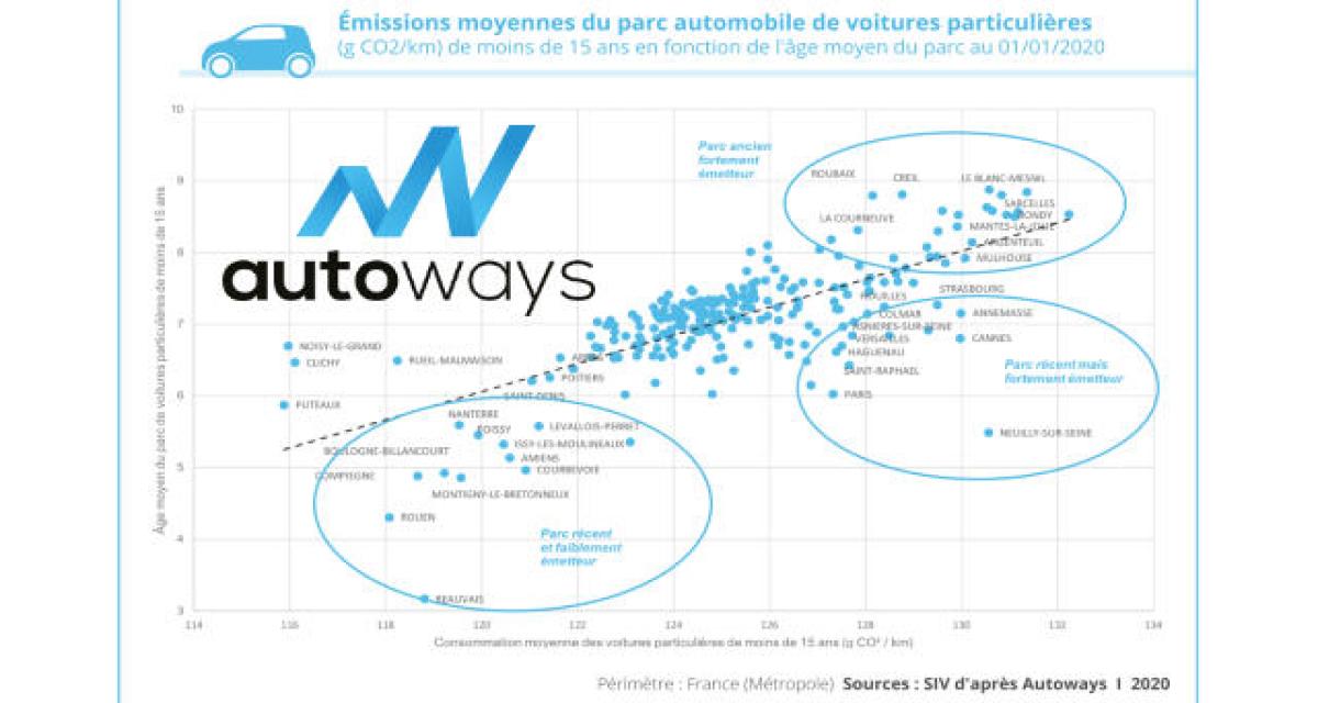 A l’opposé, la banlieue populaire, mais aussi Roubaix ou Mulhouse avec des véhicules bien plus âgés et plus émetteurs de CO2. On noter également comme Autoways, des véhicules récents, mais fortement émetteurs qui se trouvent surtout dans les banlieues chics et sur la Riviera…