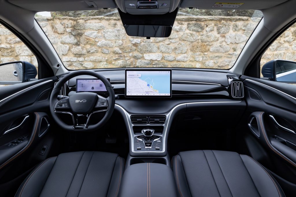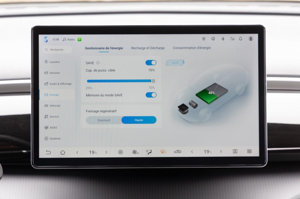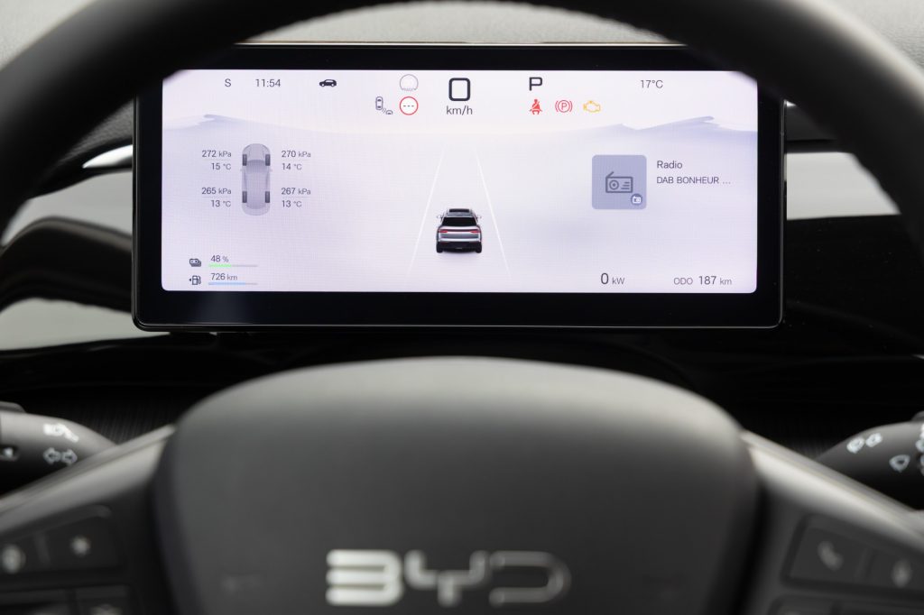 En entrant dans l’habitacle, on constate que BYD a choisi un dessin de planche de bord assez simple, sans chercher à trop impressionner. L’instrumentation se compose d’un écran derrière le volant et d’une gigantesque dalle au milieu de la planche de bord. Pour le reste, on trouve quelques commandes physiques pour des fonctions essentielles comme le volume, les modes ou d’autres programmes relatifs à la conduite. Le sélecteur est extrêmement simple : PRND, sans mode B. Il regroupe énormément de technologies qu’il faut malheureusement gérer depuis l’immense écran, en naviguant dans divers menus pour atteindre notre but. Il existe bien quelques raccourcis, notamment pour faire taire certains ADAS agaçants, mais il faut du temps pour tout comprendre.