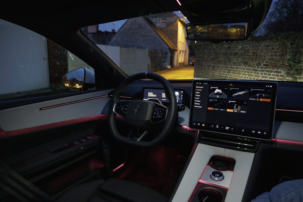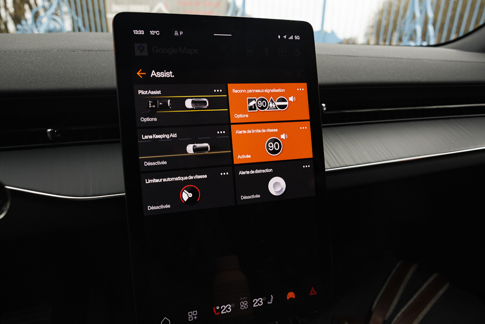 Sur le tracé encore peu sinueux, on tente de connecter l’intégralité des aides à la conduite, jusqu’à la régulation automatique de l’auto aux limitations. Une mauvaise idée ! La détection des panneaux est véritablement hasardeuse, et ce réglage voit alors opérer de fréquents freinages intempestifs : intrusif et dangereux. Les aides à la conduite ne nous ont, d’ailleurs, globalement pas emballés, un comble pour le frère de Volvo, normalement impassible sur la sécurité. Aussi, le dépassement automatique fonctionnait en début de trajet … mais plus pour longtemps. C’est finalement le régulateur (forcément adaptatif et lié au semi-autonome de niveau 2) qui s’est ensuite mis en défaut, sans autre raison que la pluie (?!). Un défaut pardonnable sur des jeunes constructeurs chinois qui se lancent, (et ils progressent vite !) bien moins pour l’associé premium et dynamique de Volvo.