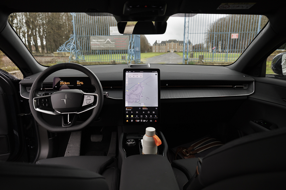 Tout de suite, l’auto se montre plus ferme que la Polestar 4 de la veille. Avec une suspension classique, il semble logique que les ingénieurs aient dû raffermir l’auto, volumineuse et lourde, pour mieux coller au dynamisme de l’image Polestar. Si l’auto absorbe moins bien les dos d’ânes, le compromis reste très acceptable, notamment pour les longs trajets autoroutiers. Transition douce également avec la Polestar 4 concernant l’agrément de conduite, de belle qualité, mais aussi des aides à la conduite capricieuses !