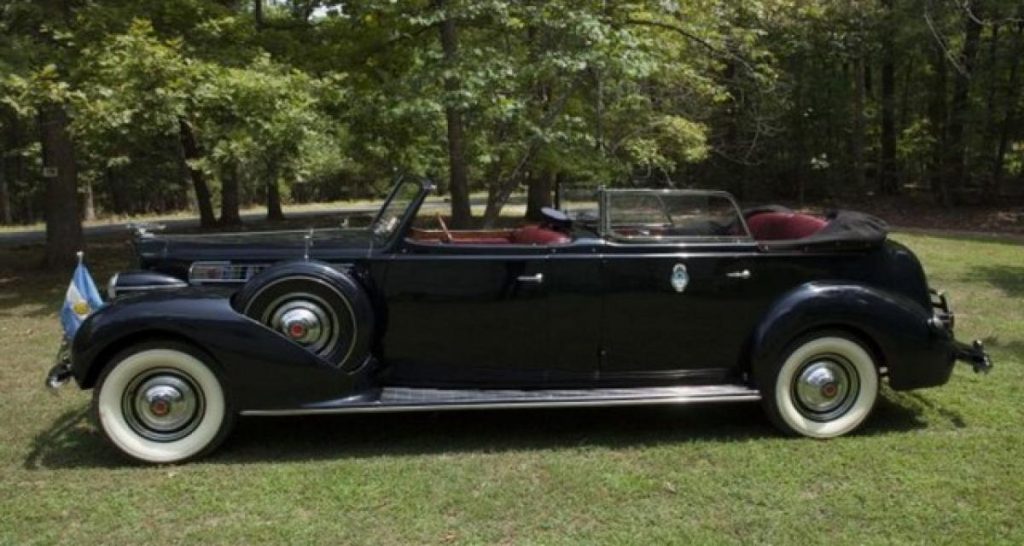 Perón était connu pour son amour des voitures. Il existait un sport auto argentin, avant lui. Néanmoins, sous son impulsion, le Grand Prix de Buenos Aires devint une épreuve internationale. Il poussa également des pilotes Argentins en Europe (dont Juan Manuel Fangio.) Cette Packard Super Eight était donc la voiture d’un passionné. Elle fut carrossée par Derham, à Philadelphia. Signe particulier : elle avait la conduite à droite. D’après Sold ASAP, Perón l’appréciait tout particulièrement. Après le coup d’état de 1955, tout ce qui touchait à Perón devenait interdit. La Packard fut discrètement cachée dans un chenil. Elle en fut ressorti dans les années 70, puis ramenée aux Etats-Unis. Le marché de l’ancienne décollait et nombre de négociants sillonnaient l’Amérique latine et les Caraïbes à la recherche de modèles anciens. L’homme d’affaires Raymond Plaster acheta la Packard -en très mauvais état- et il la fit restaurer pendant 19 ans.