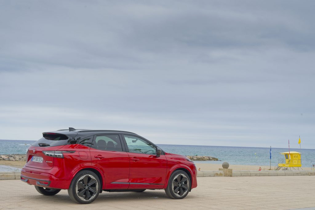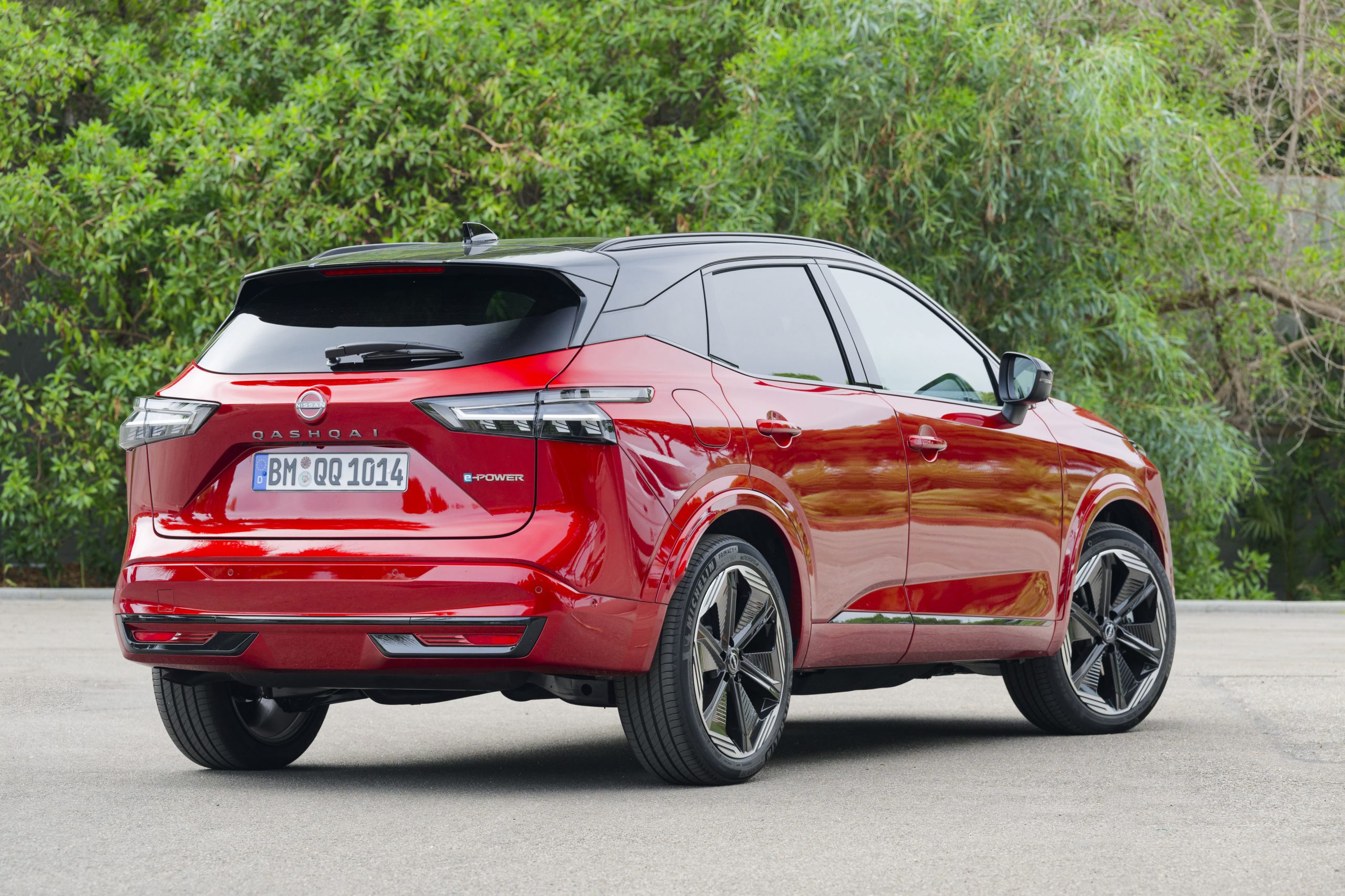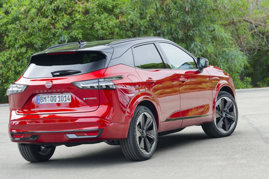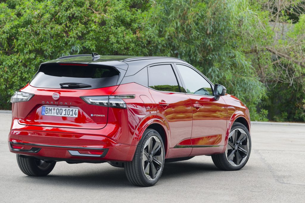 La carrosserie du Qashqai E-Power conserve les principales lignes et proportions du modèle actuel : 4,42 m de long, 1,83 m de large et 1,62 m de haut. Seules quelques retouches sont observables sur les passages de roues, les rétroviseurs et l’aéro des boucliers, ajoutant une légère modernisation sans bouleverser la silhouette générale.