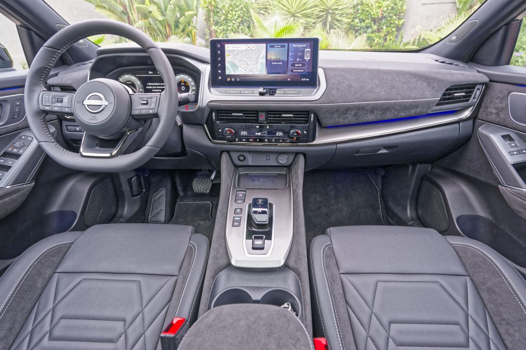 Le Qashqai reste homologué pour cinq places : l’espace à l’avant est bon, celui à l’arrière pénalisé au centre par le tunnel technique. Le coffre affiche un volume de 455 l, extensible à plus de 1 600 l une fois la banquette rabattue. Côté équipements, les aides à la conduite sont généralisées dès l’entrée de gamme avec le freinage d’urgence, la lecture des panneaux, l’alerte de franchissement de ligne et le régulateur adaptatif.