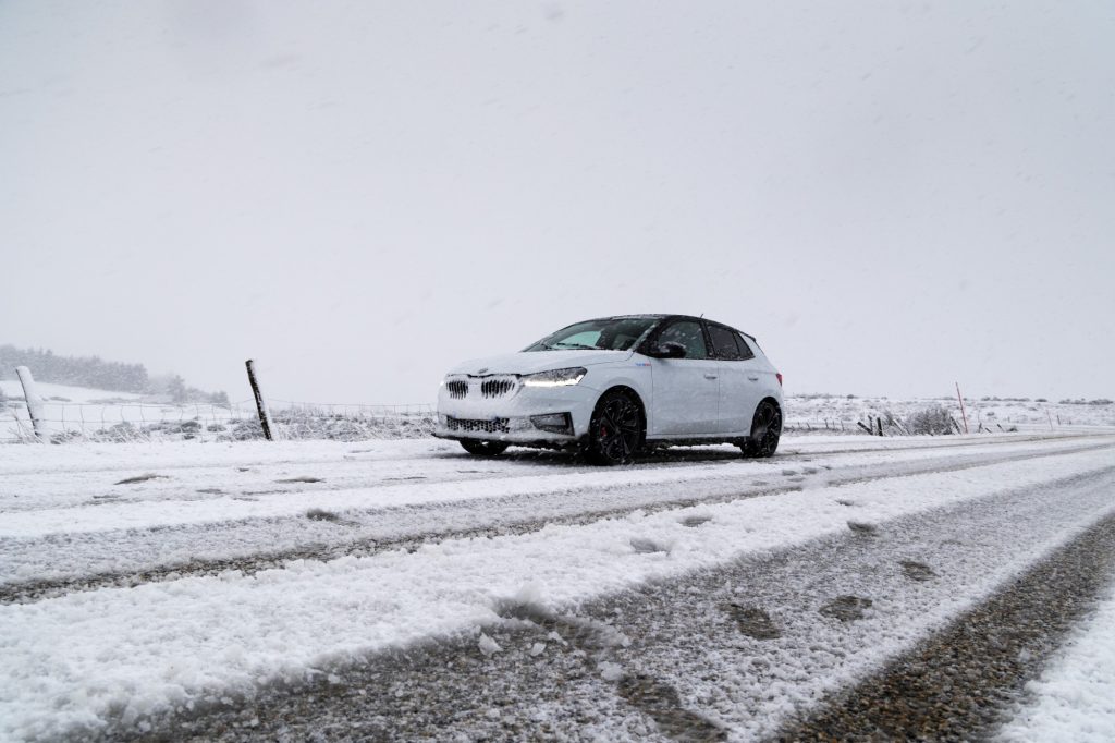 Cette édition 130 rend hommage aux 130 ans, mais donc aussi à la puissance ici exprimée en kW. Ne sortez pas votre calculatrice, on a déjà fait le calcul pour vous, cela fait 177 chevaux. De quoi atteindre les 100 km/h en 7,4 s. Avec les conditions très humides, on ne s’en est pas rapprochés, toutefois il est intéressant de noter une bonne motricité malgré le puissant couple de 250 Nm de cette traction. Au passage, nos gommes hiver nous ont permis de rouler dans une soupe de neige, comme les concurrents du Monte-Carlo cette année. La voiture s’est plutôt bien comportée, ce qui renforce le sentiment de sécurité globale de cette Fabia de seulement 1 270 kg. Ici tout est constant, l’accélération, l’attaque de la pédale de frein notamment. Pas d’à-coups parasites comme on l’a parfois au volant d’une voiture ne serait-ce que légèrement électrifiée.