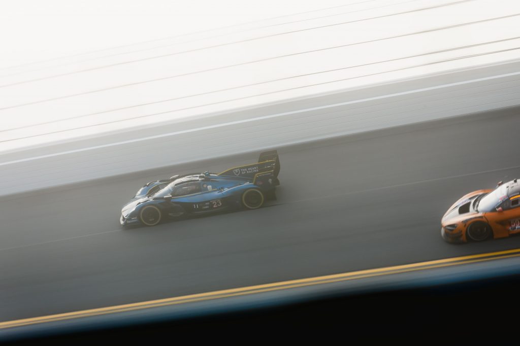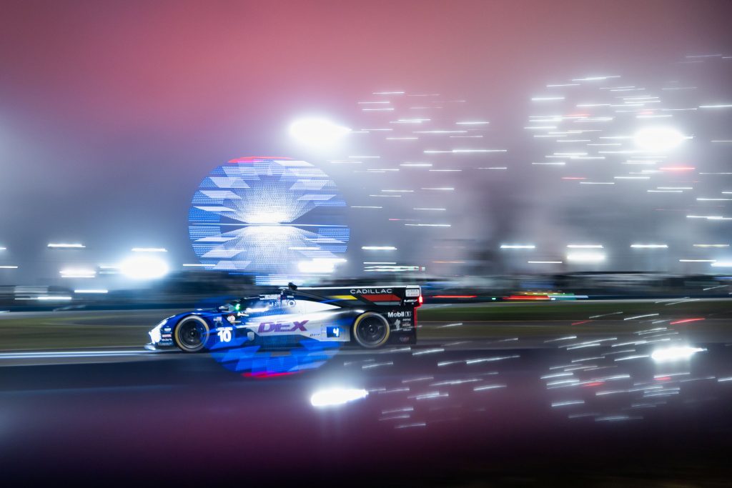 Dans la brume. Pendant la nuit, l’épreuve a été marquée par l’irruption du brouillard. La faible visibilité a justifié une neutralisation de 6 heures et 33 minutes derrière la voiture de sécurité (qui a elle-même effectué des pleins d’essence), la plus longue jamais vue en IMSA.