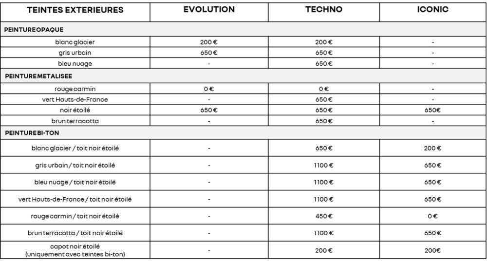La R4 autonomie urbaine n’est disponible qu’en finition « Evolution ». Pour avoir plus de teintes de carrosserie, il faut au moins la finition Techno. Pour avoir la couleur « vert Hauts-de-France » ou « bleu Nuages », il faut a minima cette finition.