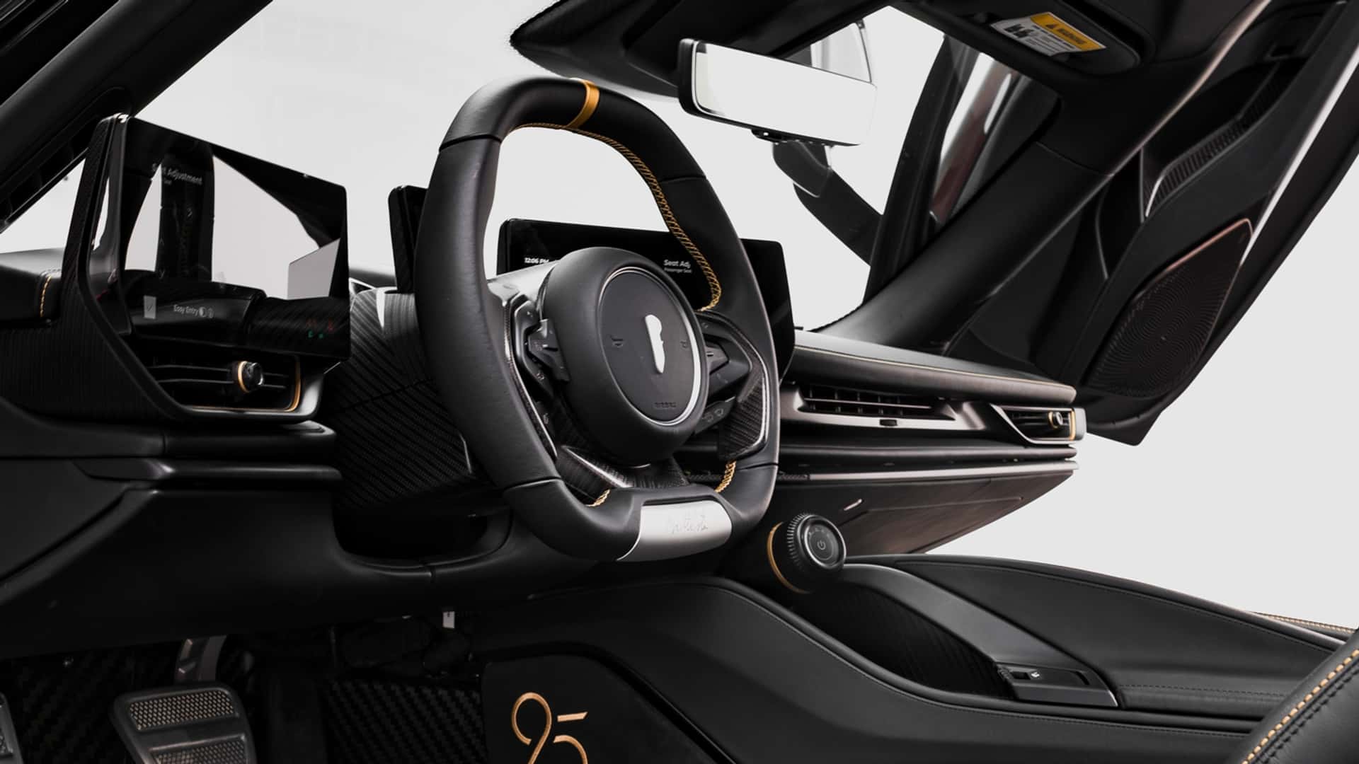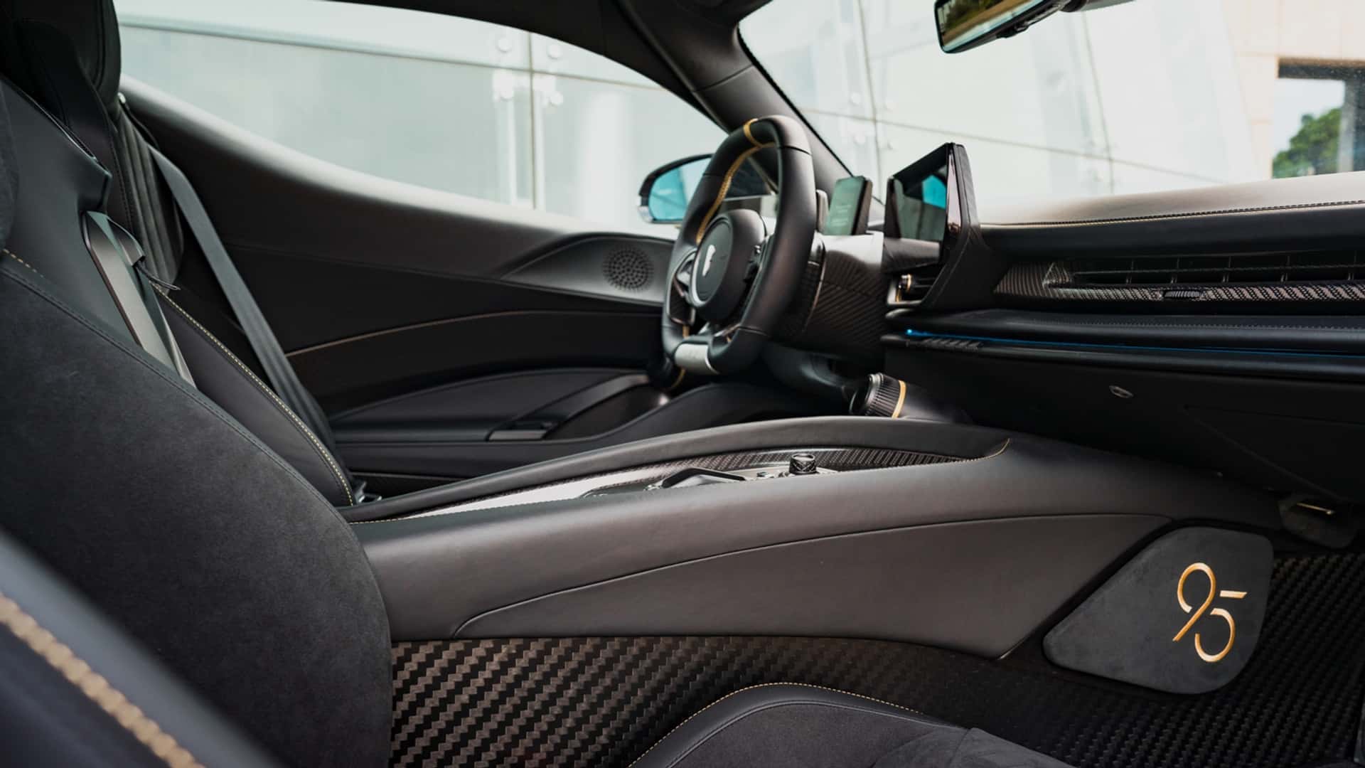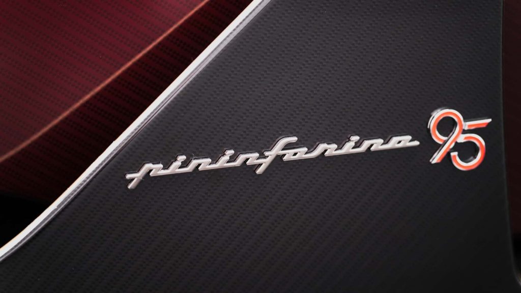 L’intérieur reflète la même exclusivité que l’extérieur. Les sièges Pilota, habillés de cuir et d’Alcantara noir, ont des surpiqûres bicolores noir et or, tandis que le logo « 95 » brodé en or sur les repose-genoux célèbre l’anniversaire important de Pininfarina . Des matériaux nobles tels que le carbone satiné apparent et l’aluminium anodisé dominent l’espace. Les commandes rotatives en aluminium usiné dans la masse sont réalisées spécialement pour cette édition.