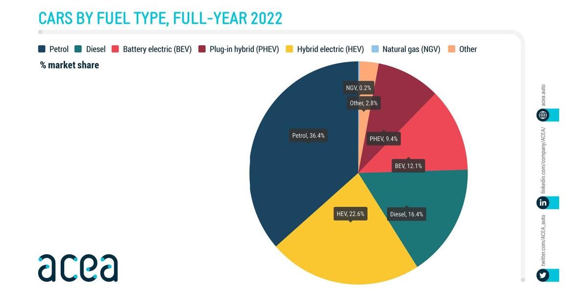 L’Association des constructeurs européens (ACEA) dévoile les caractéristiques des motorisations des véhicules neufs vendus en Europe en 2022. 12,1% sont électriques à batterie et cela constitue un record.