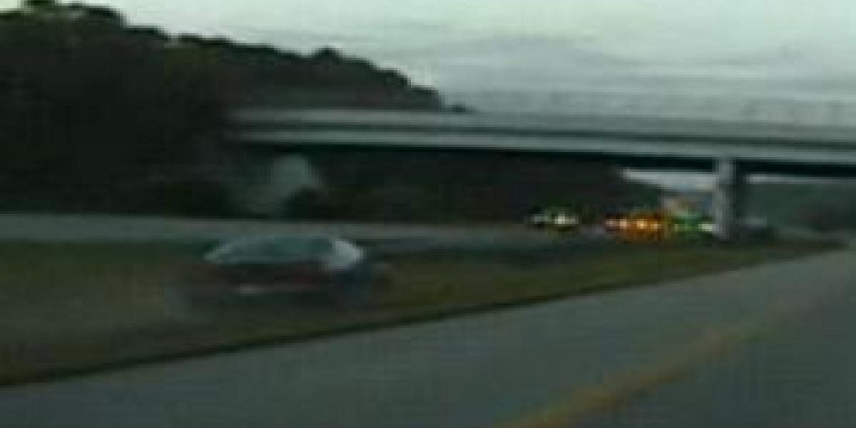 La scène a été tournée via une caméra embarquée dans une voiture de police. Un jeune conducteur, 19 ans visiblement, perd le contrôle de sa Pontiac Firebird, quitte la chaussée, traverse le terre-plein central, s’envole alors que son auto s’encastre littéralement contre un pilier de pont. Ejecté de son auto ce conducteur en excès de vitesse a été envoyé à plusieurs mètres. Bilan de l’incroyable saut ? Il n’a pas succombé à ses blessures mais se trouve malheureusement (enfin pas de surprise…) dans un état critique. A la vue de la violence inouïe du choc, on comprend pourquoi.