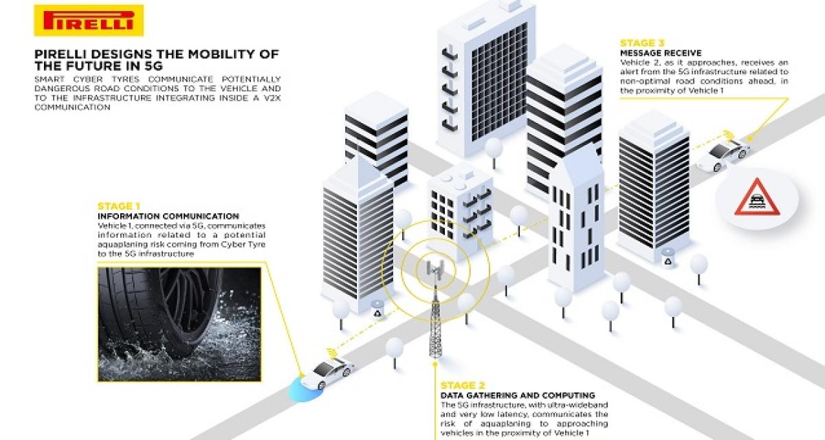 Pirelli mais aussi Ericsson, Audi, Tim (2e opérateur mobile en Italie), Italdesign et KTH (École royale polytechnique de Suède) ont organisé une démonstration sur le toit du fameux Lingotto (l’ancienne usine emblématique de FIAT avec la piste d’essais sur le toit) avec le pneu Pirelli Cyber Tire. Équipé de capteurs et connecté au réseau 5G, ce pneu a pour vocation de transmettre des informations sur les risques de la route, comme l’aquaplanage qui, détecté par les pneus, a été transmis à la voiture suivante, grâce à la faible latence de la 5G.