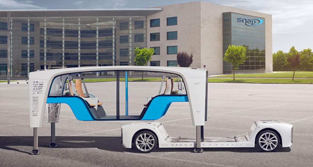Depuis plusieurs années, Rinspeed a focalisé son attention sur le secteur de la voiture autonome. Fidèle à son habitude, il dévoile chaque année un concept avec de nouvelles idées, et ce fut donc cette année le Snap. Un concept de véhicule totalement autonome, séparé en deux : une plateforme technique type skateboard, sur laquelle viennent se greffer différents modules. Transport de personnes ou de biens, le Rinspeed Snap propose un panel complet, et une possibilité d’utiliser également les modules en mode stationnaire.