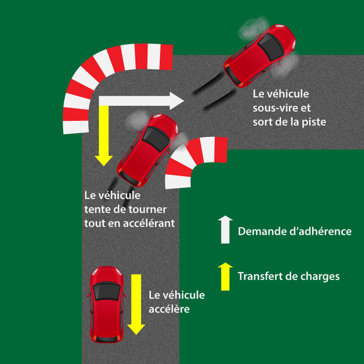Le conducteur accélère en ligne droite et demande à ses pneus d’utiliser une partie de leur potentiel d’adhérence. Dans le même temps, la masse est transférée vers l’arrière, allégeant la charge à l’avant. Admettons que le conducteur ne relâche pas les gaz, persuadé de conduire une Formule 1, et se mette à tourner. Étant donné que les pneus avant ont consommé une grande partie de leur adhérence, les contraintes latérales exercées en plus vont les conduire à dépasser leur potentiel.