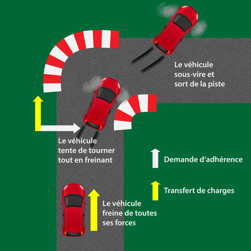 Un transfert de charge important va s’opérer vers l’avant, s’approchant des limites d’adhérence des pneus. Si le conducteur tente en plus de tourner sans relâcher les freins, les pneus avant vont glisser de la même manière que précédemment.
