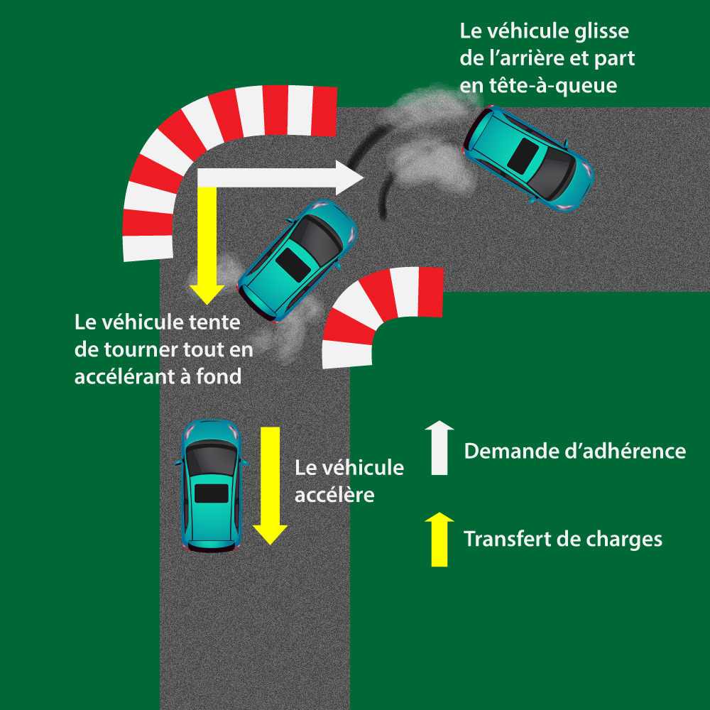 A partir de ce moment, alors que le transfert de charges s’opère sur l’arrière avec l’accélération, le fait de cumuler un transfert latéral va emmener les pneus arrière au-delà de leurs capacités. Ils vont alors se mettre à glisser et le véhicule va partir en tête-à-queue.