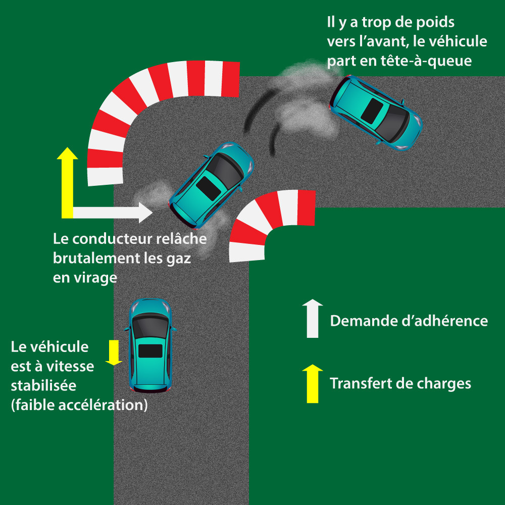 Prenons maintenant un dernier exemple : le véhicule est déjà en mouvement et prend le virage. Le conducteur garde le pied légèrement sur l’accélérateur, mais trouve qu’il va encore un peu vite dans le virage. Il décide alors de relâcher totalement les gaz, ce qui ralentit le véhicule. Comme dit plus haut, l’action de ralentir, comme de freiner, va effectuer un transfert de charges dans la direction opposée, c’est-à-dire vers l’avant. Les pneus arrière se trouvent fortement délestés et adhèrent moins au sol. Le véhicule va alors se mettre à glisser de l’arrière et perdre en stabilité.