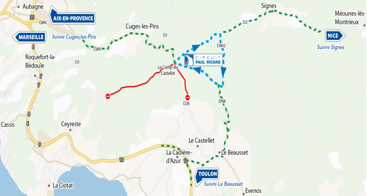Le cadre et la position du Castellet, sur un plateau entre Marseille et Toulon offre un cadre magnifique, un trajet des plus agréable, sur des routes vallonnées dans un cadre verdoyant. Dans un tel contexte il est certain que nous ne trouverons pas une autoroute dans le coin, ni même un grand axe routier. Ce sont donc deux routes départementales très simples qui permettent l’accès au circuit.