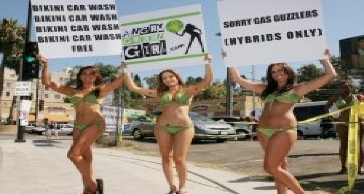 Pourquoi pas après tout. Un regroupement de jeunes femmes appelé « Angry Green Girls » milite pour un respect maximal de l’environnement. Sympathique démarche à but non lucratif qui s’inscrit à travers diverses campagnes de communication. Ainsi par exemple à Hollywood, histoire d’inciter un brin à l’achat quoi de mieux que d’offrir un lavage du véhicule en bikini (vert évidemment…) ? Hein, quoi de mieux, je pose la question.