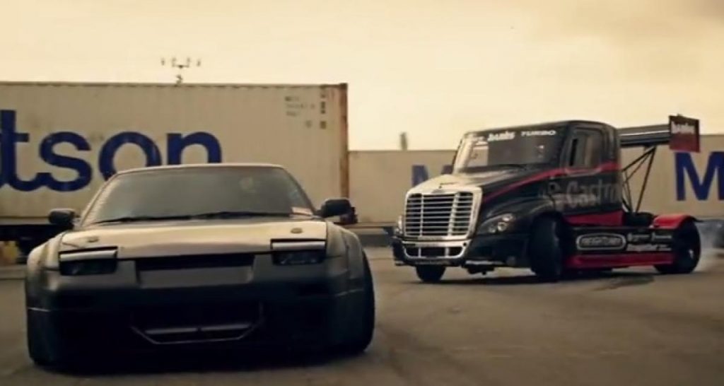 Ce n’est pas son premier essai puisqu’il y a 3 ans il filmait déjà sa semi. Si les images et la mise en scène n’atteignent sans doute pas celle de Block, le combat du Banks Super-Turbo Freightliner avec la Nissan 240SX (2) sur les docks de Long Beach est tout de même divertissant et impressionnant. Place à la vidéo.