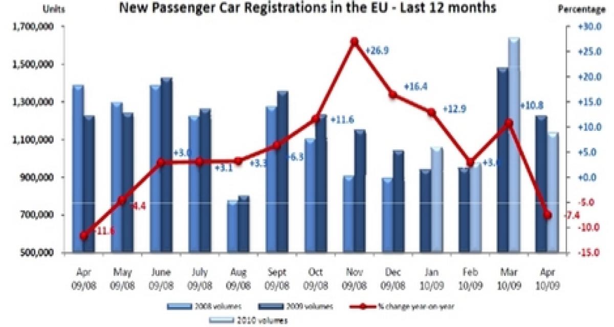 Ce qui devait fatalement et forcément survenir un jour ou l’autre s’est finalement produit en avril dernier. A cette période le marché automobile européen s’est contracté de 7,4 %, premier recul depuis dix mois. Selon les chiffres officiels fournis par l’Association des constructeurs européens d’automobiles (ACEA), 1 134 701 véhicules neufs auront été immatriculés à cette période. L’ACEA de pointer les difficultés économiques en Europe ou la fin/baisse des dispositifs de soutien à l’achat comme causes principales de cette baisse.