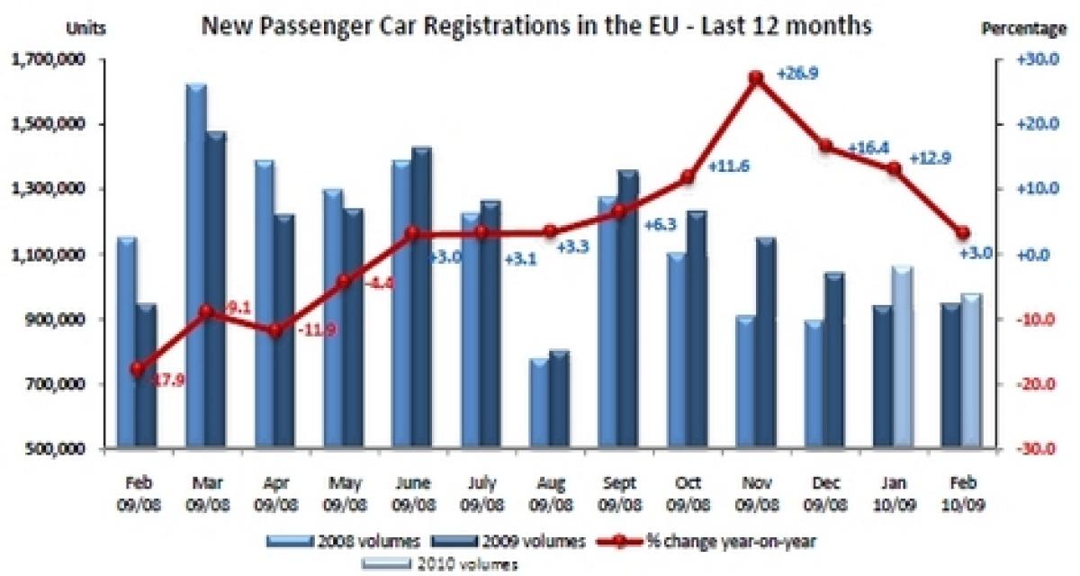 Au fil des mois, comme l’illustre le graphique de ce billet, le marché européen chute doucement mais sûrement. Après une progression (à tempérer) de 12,9 % en janvier, le dernier exercice de février montre un fort ralentissement avec une progression contenue à 3 %.  Selon les chiffres officiels fournis par l’Association des constructeurs européens d’automobiles (ACEA), le marché européen a donc bouclé février en hausse timide de 3,0 % à 1 000 754. De quoi augurer d’une suite d’année 2010 bien plus compliquée.