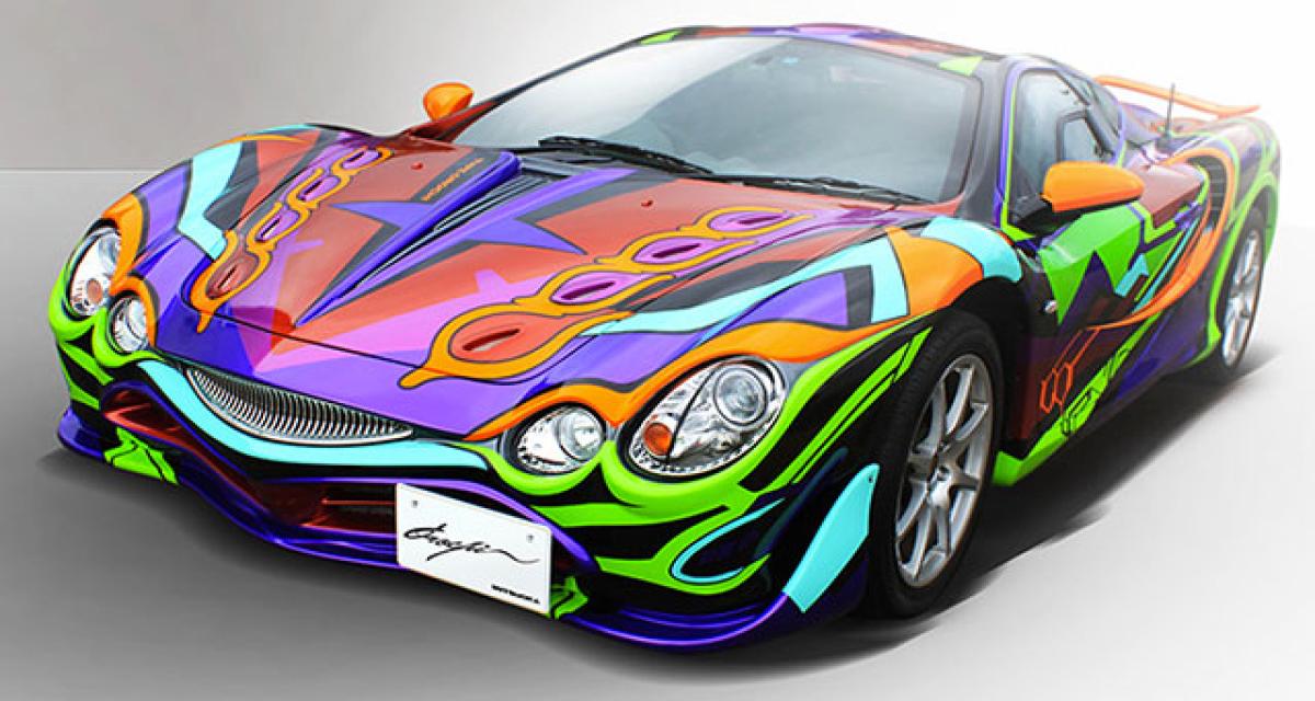 Cette fois, la pièce est unique et l’étiquette affiche 16 millions de yens, ce qui met l’Orochi « art car » au prix d’une Porsche Carrera 4S. Ah oui, tout de même. Sous les entrelacs mauves et verts, Les Orochiphiles distingués auront reconnu les attributs caractéristiques du modèle « Premium Gold », l’aileron et le bouclier avant spécifiques. Effectivement, chez Mitsuoka, un sou est un sou et les voitures n’ont pas vocation à rester éternellement à prendre la poussière dans le showroom. Toutes les Orochi produites ayant été vendues, celle-ci ne sort pas de la chaîne de montage. Sous la peinture fraîche, la fiche technique nous apprend que nous sommes en présence du démonstrateur de la série Premium Gold, numéro de châssis 96, première immatriculation en octobre 2011 et 24 000 km au compteur du V6 Toyota. Bonne nouvelle, le contrôle technique vient d’être fait et est bon pour deux ans ! 7-Eleven prévoit de crouler sous les demandes à faire entre aujourd’hui et le 30 novembre et un tirage au sort sera organisé pour désigner l’heureux lauréat qui aura l’honneur et le privilège de présenter 16 millions de yens au comptoir pour repartir avec la voiture de ses rêves en couleurs.