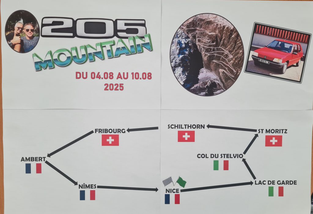 Pour terminer cette présentation, voici le parcours : départ de Nice le lundi 4 août, avec l’enchaînement de 7 étapes jusqu’au 10 août, puisque nous allions dormir dans un lieu différent chaque soir. Passage en Italie via le Col de Tende, direction le lac de Garde, puis le col du Stelvio, avant de basculer en Suisse pour la traverser d’est en Ouest sur 3 jours. Enfin, retour en France via le Jura, en direction du Forez, avant de traverser les Cévennes, en direction de la région du pont du Gard, ultime halte avant le retour sur Nice. De nombreux cols nous attendent ! Et histoire que personne ne rate notre expérience, une grande affiche a été scotchée sur la lunette arrière de la 205 avec nos visages, une photo de la voiture et surtout l’intégralité des étapes.