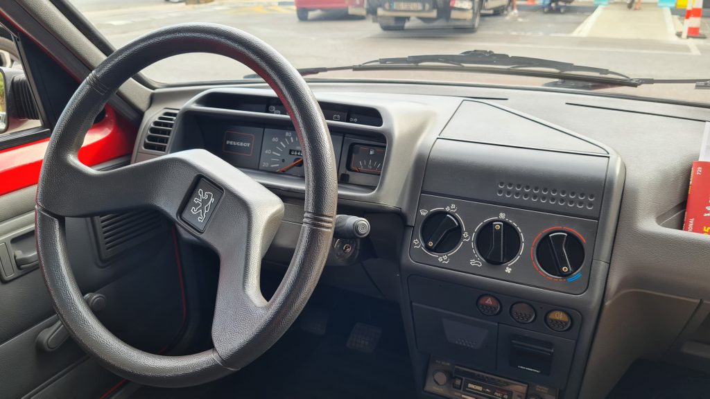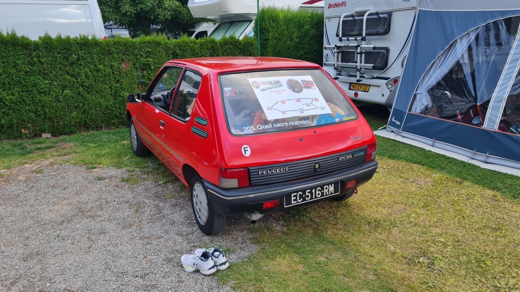 L’ascension se fait sous un temps radieux, mais nous sommes en fait souvent ralentis par des véhicules bien plus modernes, dont les conducteurs se montrent très lents dans les prises d’épingle ou le dépassement des cyclistes. La 205 se trouve même coupée dans son élan à force de talonner un convoi de DS7 Crossback et Audi A6 Avant qui étaient quasiment à l’arrêt dans chaque lacet ! La puissance ne fait pas tout, et le gabarit des véhicules modernes n’est pas aisé à appréhender pour tout le monde ! Evidemment, les modernes reprennent de l’avance dès qu’un secteur plus droit apparaît, à la faveur d’un bon coup de turbo, alors que la Junior doit plafonner en seconde à 40/45 à l’heure maxi. Le passage en troisième n’est pas envisageable pour le petit 954cc qui s’époumone mais tient bon. Quelques virages suffisent pour recoller aux escargots surmotorisés ! C’est même ces ralentissements qui ne plaisaient pas au moteur, qui préférait garder son élan, puisqu’il était possible, avec l’agilité du châssis et de bonnes trajectoires, de prendre les lacets en seconde et de tenir le rythme.