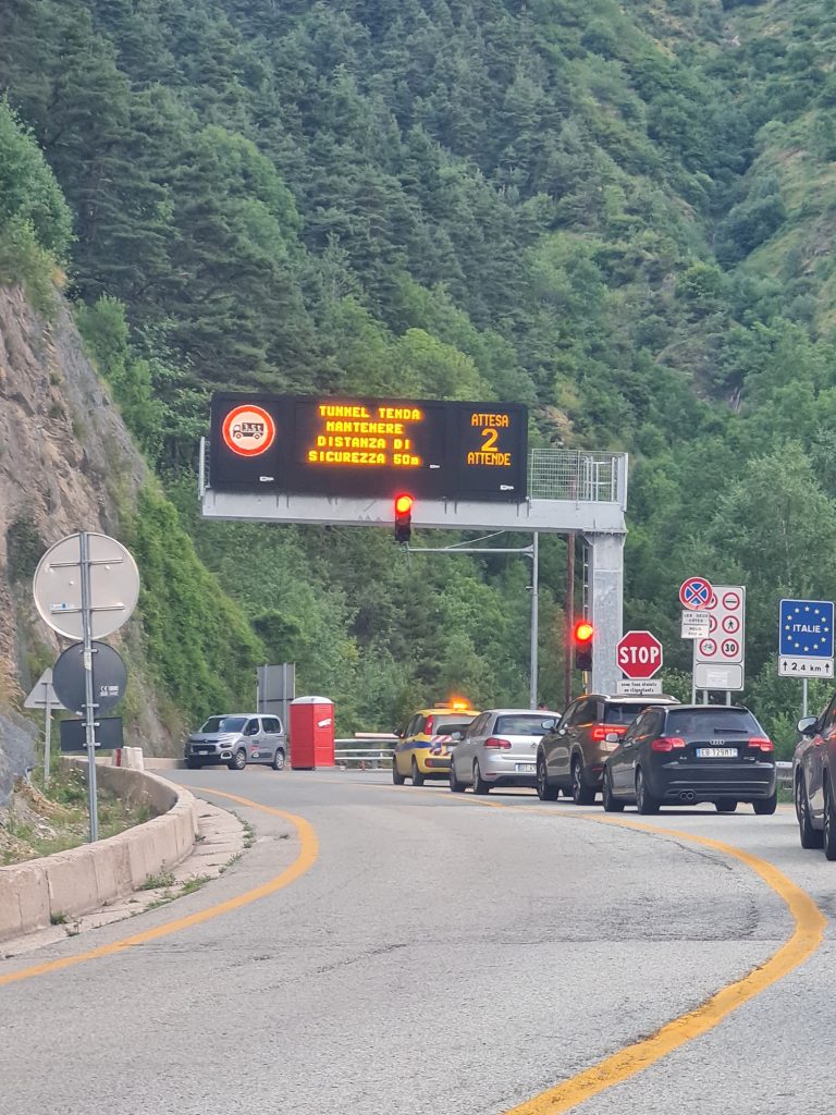 Départ à 5 heures, histoire d’éviter un maximum le trafic et la chaleur. L’objectif est aussi de minimiser les portions autoroutières, pour apprécier le plaisir des routes secondaires, de la navigation et aussi éviter un blocage à un péage en plein cagnard. Après un court tronçon autoroutier pour passer en Italie, nous quittons l’Autostrada dei Fiori à Vintimille pour emprunter la vallée de la Roya, direction le col de Tende qui nous fera basculer vers la plaine du Piémont. Le tunnel de Tende a enfin rouvert, après plus de 10 ans de travaux. Même si la circulation est encore alternée le temps que toutes les voies soient opérationnelles, le changement est spectaculaire en comparaison de l’ancien tunnel qui ressemblait à une grotte étroite ! Les gros blocs dans le lit de la Roya et les nombreux travaux le long de la route rappellent aussi à quel point la tempête Alex de 2020 a été terrible dans cette zone également.