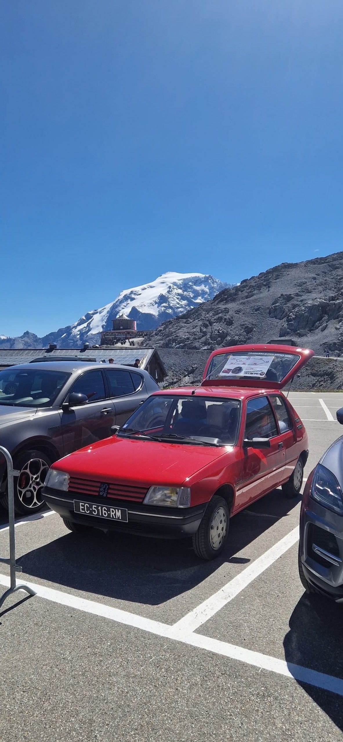 Le grand moment de la journée est évidemment l’ascension du mythique col du Stelvio, ou Stilfersjoch, qui a fêté ses 200 ans en 2025. Au programme, en arrivant depuis Prato Allo Stelvio, 24.3 kms de montée à 7,4 % de moyenne, 48 lacets et un sommet à 2758 mètres, le plus haut d’Italie, seulement 6 mètres plus pas que le recordman des Alpes, le col de l’Iseran. Le Stelvio est bien entendu un nom cher aux Alfistes, sans oublier qu’il a vu passer bon nombre de courses de côte, de rallyes et d’étapes du Giro en cyclisme. C’est le premier moment fort pour la 205, qui doit composer avec un trafic dense (motards, cyclistes, etc) et sa surcharge pondérale, en raison des bagages et des deux gaillards à bord (surtout votre serviteur, qui dépasse les 90 kilos).