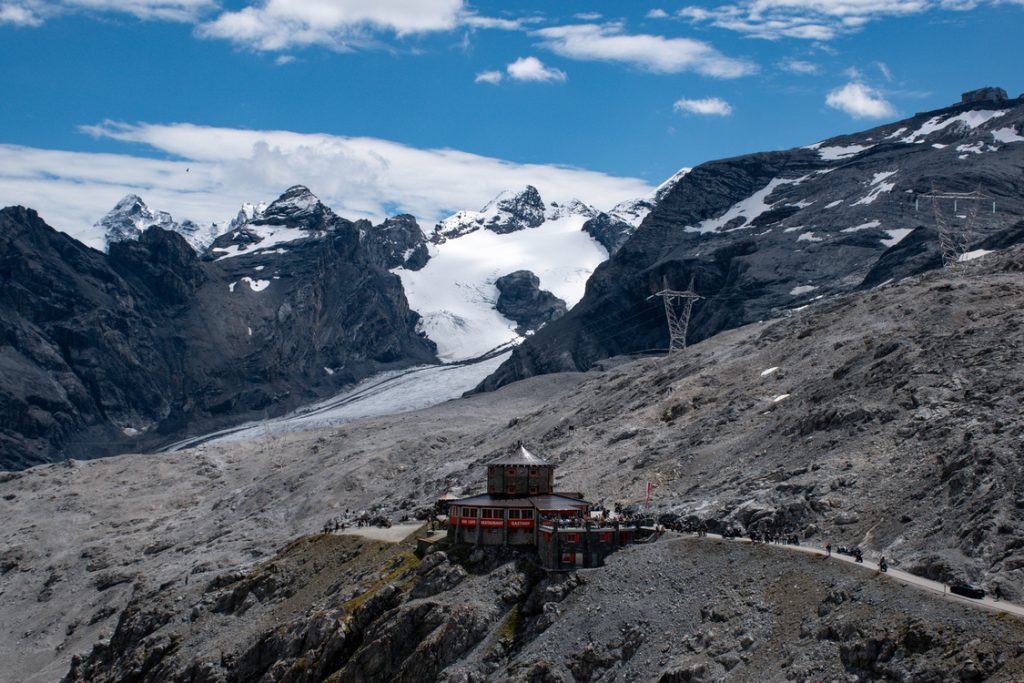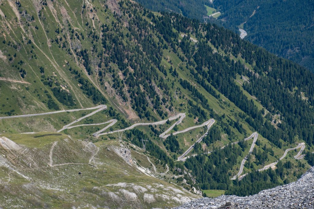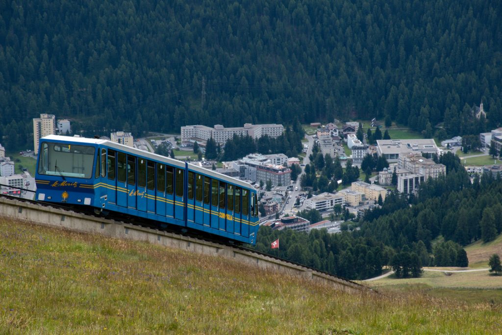 Le départ du Stelvio se fait à la fraîche, vers 8 heures. A la descente en direction de Bormio, on bifurque vers l’Umbrail Pass (et son charmant poste de frontière désaffecté )qui permet de descendre vers la Suisse. Un premier col, Passa dal Fuorn, permet de descendre ensuite vers Saint-Moritz, station de ski huppée du canton des Grisons, qui n’est pas sans rappeler Monaco avec ses beaux hôtels de luxe et ses magasins de standing, mais avec les montagnes, les pistes de ski et les lacs en plus, et surtout moins de gratte-ciels. La ville a été hôte à deux reprises des JO d’Hiver, en 1928 et 1948. Cette halte nous permet de profiter du funiculaire, qui grimpe jusqu’à Corniglia. Au passage, on remarque l’énorme investissement publicitaire d’Audi, qui inonde toutes les stations du funiculaire et même le terminus, au sortir duquel on peut aller se restaurer au Quattro Bar : ça ne s’invente pas.