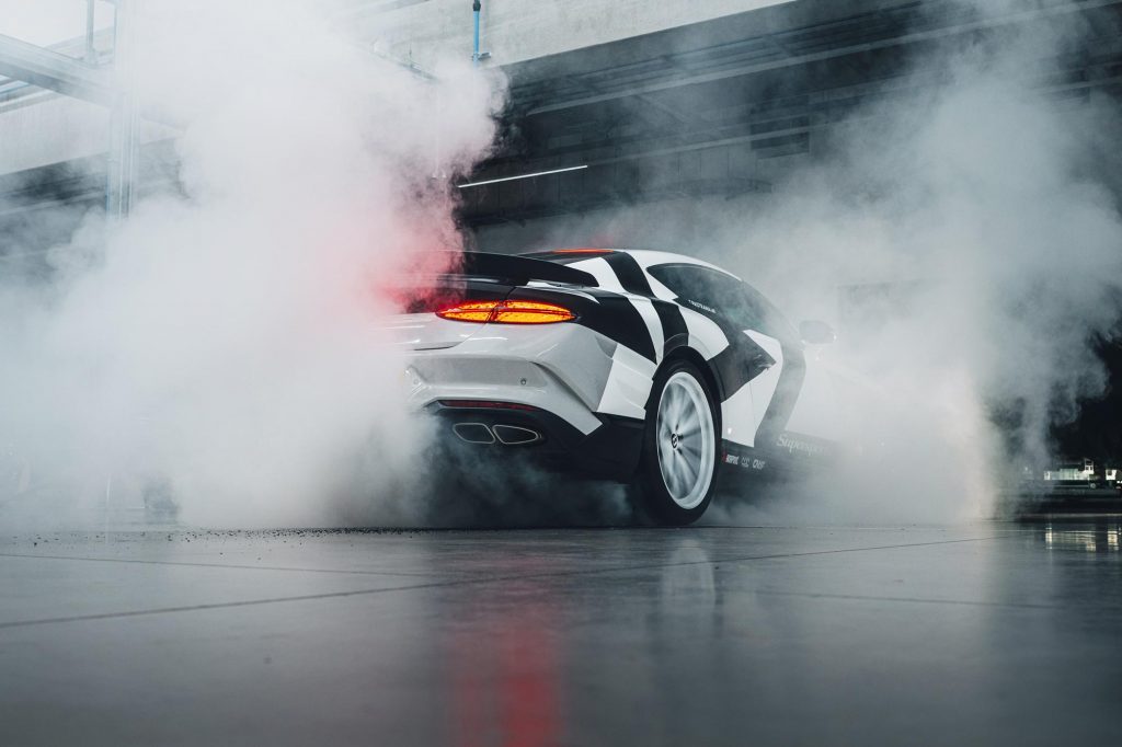 La Bentley Supersports utilisée est à propulsion arrière (*). Sa puissance annoncée atteint 666 chevaux, un hasard ce chiffre de l’Ante-Christ ? Sans doute pas. Selon le constructeur, cette architecture permet des angles de dérive prolongés, des donuts et des glissades contrôlées. Mais encore faut-il pouvoir avec un si gros paquebot.