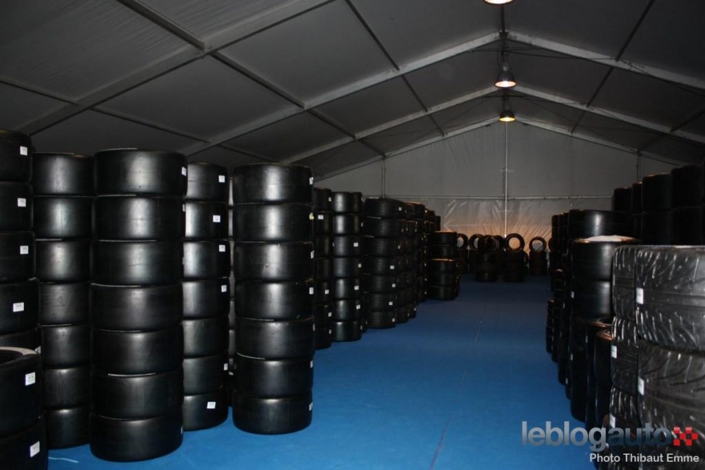 Dans les paddocks, les chariots de jantes ou de pneus vont et viennent. Une écurie emmène ses jantes à Michelin qui lui monte les gommes prévues. Puis les pneus ainsi montés redescendent vers le paddock de l’écurie et sont placés dans un appareil les maintenant à bonne température. Puis vient le moment du relais, les vieilles gommes sont retirées et les neuves sont placées. La voiture s’éloigne à peine que déjà les gommes usées sont en direction des techniciens de Michelin.
