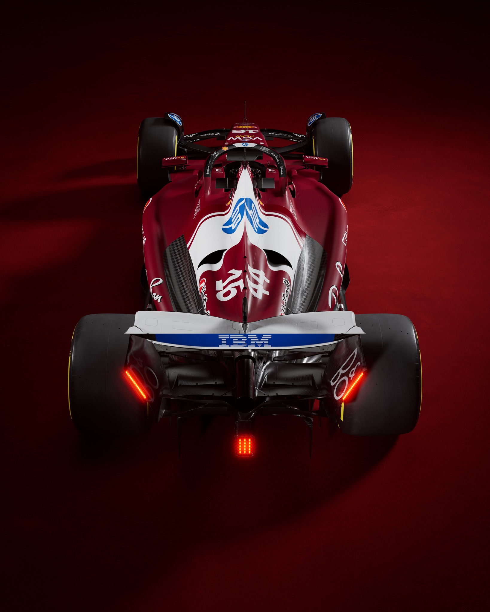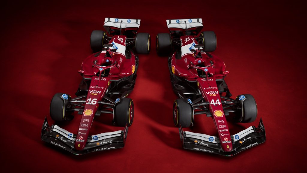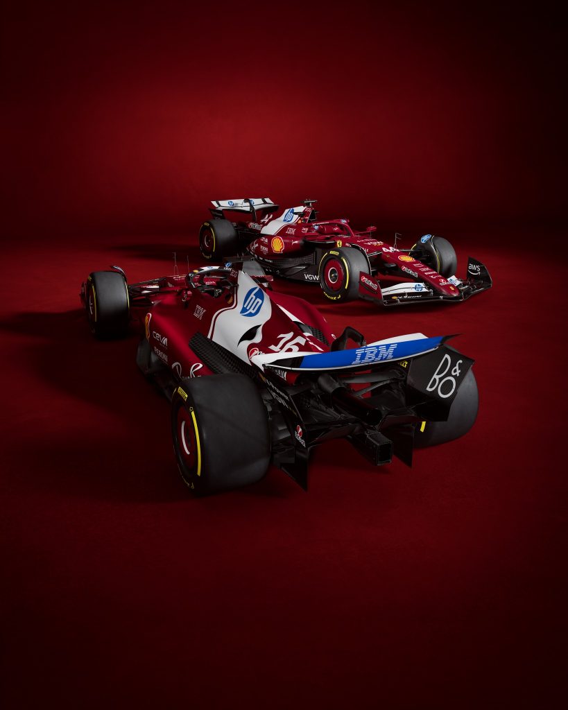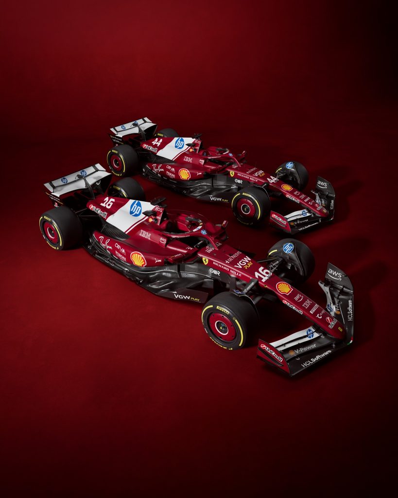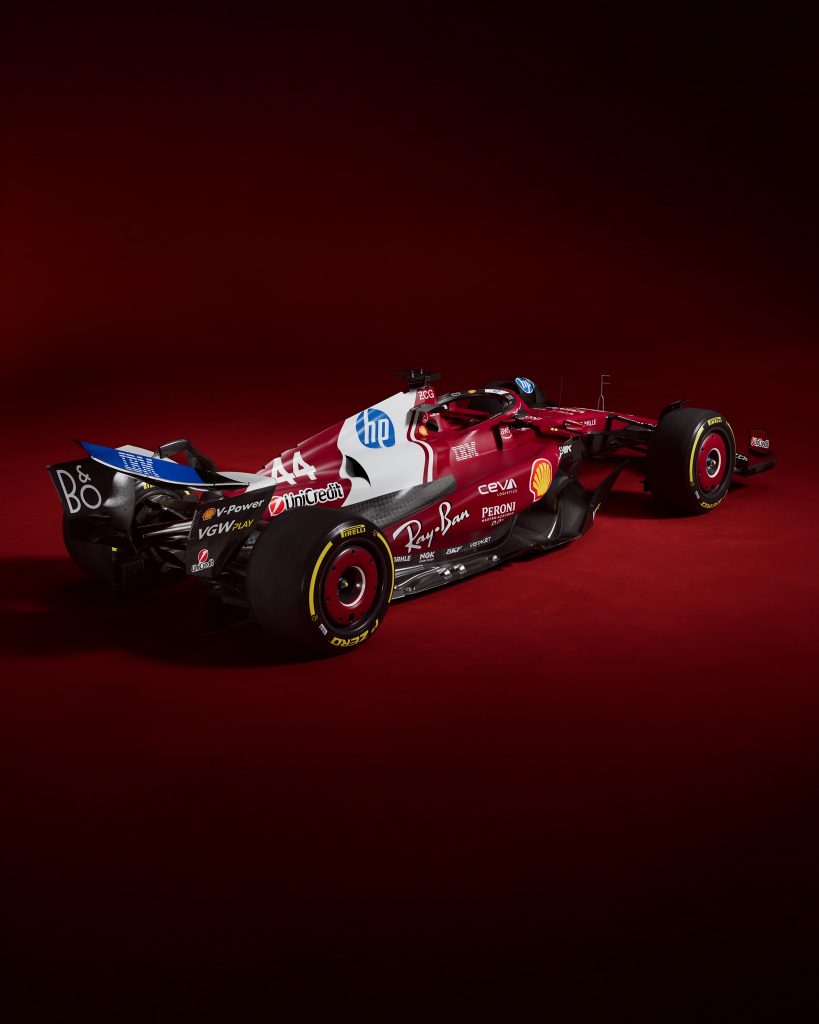 Le rouge est plus sombre, comme celui utilisé sur les machines italiennes d’avant-guerre. Surtout, le nouveau sponsor-titre HP se voit ostensiblement, avec le retour d’une large bande blanche sur le capot, frappée du logo de l’entreprise américaine, que d’aucuns jugeront sans doute malheureuse. Mais HP a payé pour ça ! Les superstitieux diront que les Ferrari avec du blanc sur le capot n’ont pas vraiment réussi ces dernières décennies (la F92A de 1992, la SF16H), mais cele marchait bien au temps des 312T des années 70 !