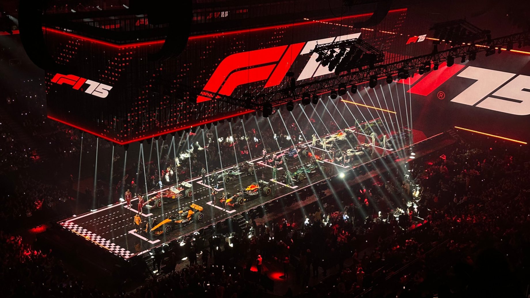 C’était la grande nouveauté de la F1 d’un point de vue médiatique : pour le 75e anniversaire du championnat du monde, toutes les équipes étaient réunies à l’O2 Arena de Londres pour un show de présentation commun devant 15 000 spectateurs, dans le pure style « américain » comme ils savent « si bien » le faire (on rappelle que le détenteur des droits de la F1, Liberty Media, est américain). Tout le gratin de la F1 était réuni, et on a même aperçu à la même table Damon Hill, David Coulthard, Tom Kristensen (qui n’a pourtant jamais couru en F1), Nigel Mansell, Jean Alesi ou encore Mario Andretti, la présence de ce dernier semblant adouber l’arrivée prochaine de Cadillac Andretti. D’autres gloires étaient réunies, comme Emerson Fittipaldi, Mika Hakkinen ou encore Jackie Stewart.