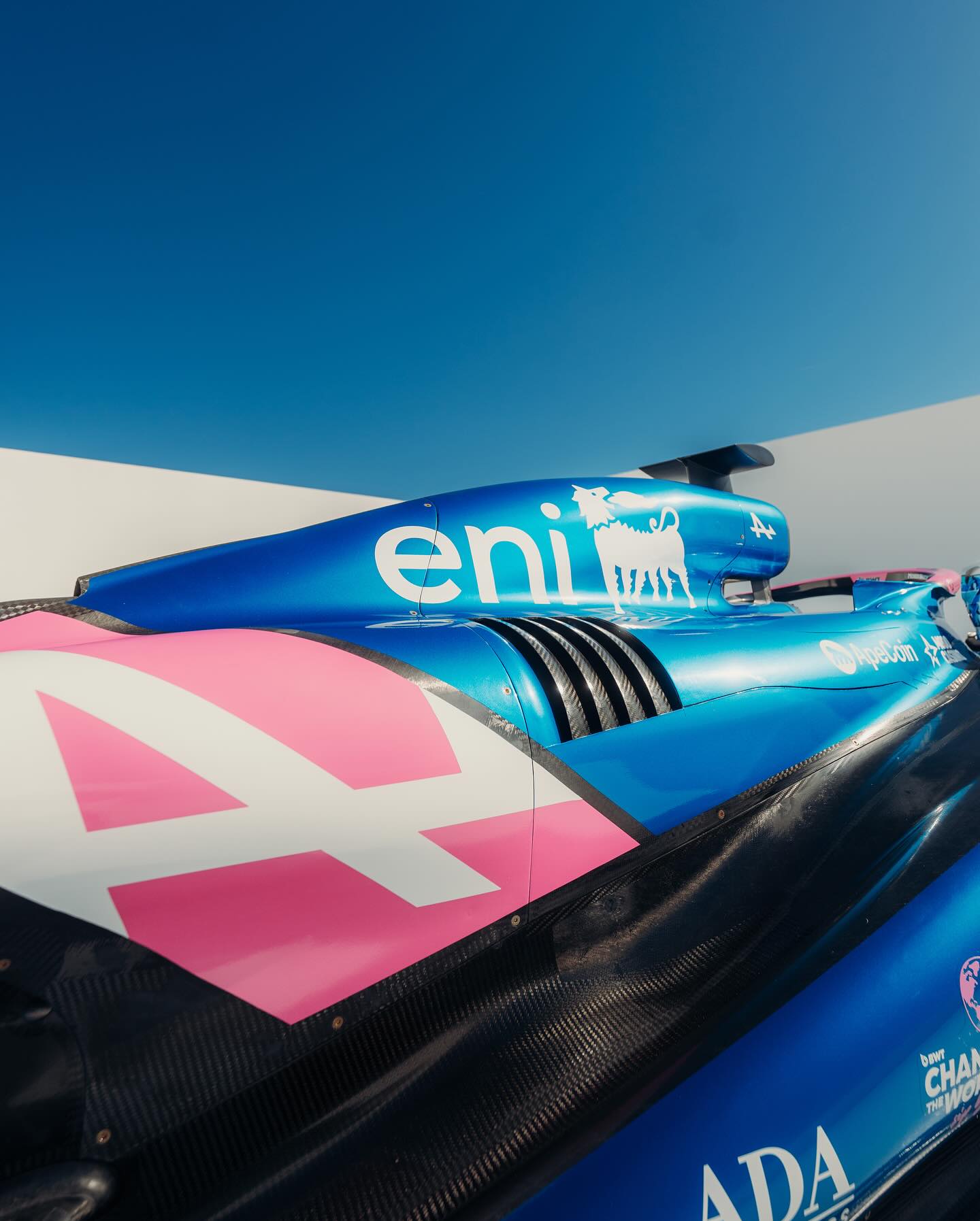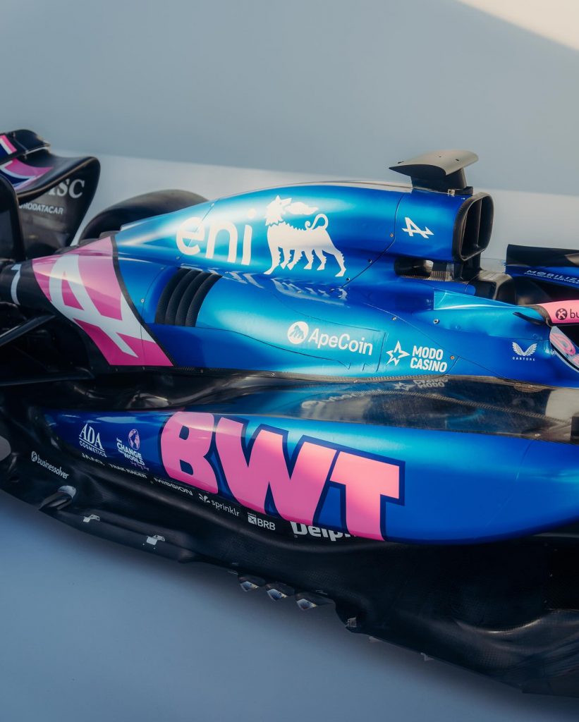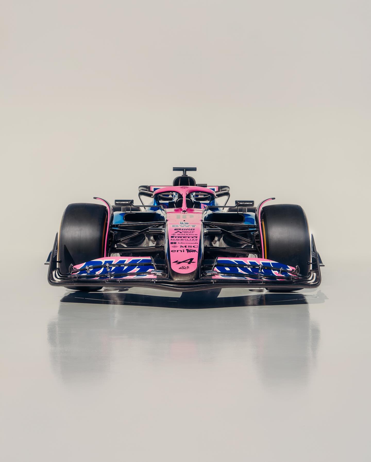 Beaucoup moins de noir cette année, l’A525 est au poids visiblement ! Trêve de plaisanterie, le rose est devenu très présent aux côtés du bleu, sur une monoplace qui arbore ses nouveaux sponsors récemment dévoilés, dont ENI et MSC Croisières. Sans suprise, Eni est en blanc, il ne fallait pas s’attendre au chien à six pattes noir sur fond jaune. De profil, l’assortiment bleu et rose passe assez bien, mais le museau est totalement rose, ce qui donne l’impression, en se mettant de face, de regarder une Force India.