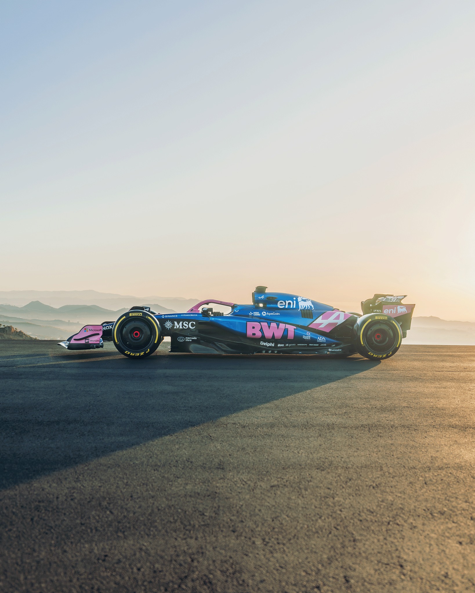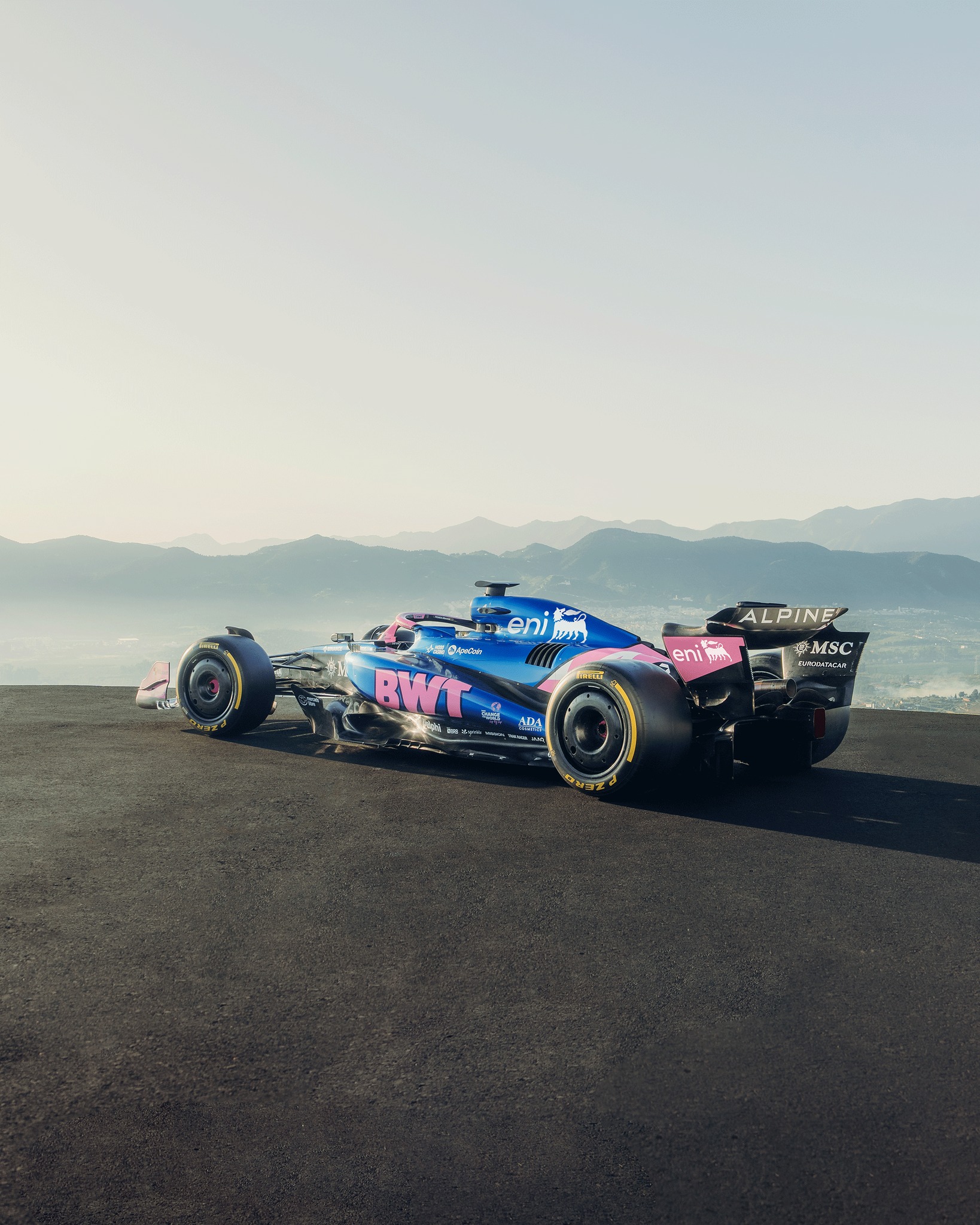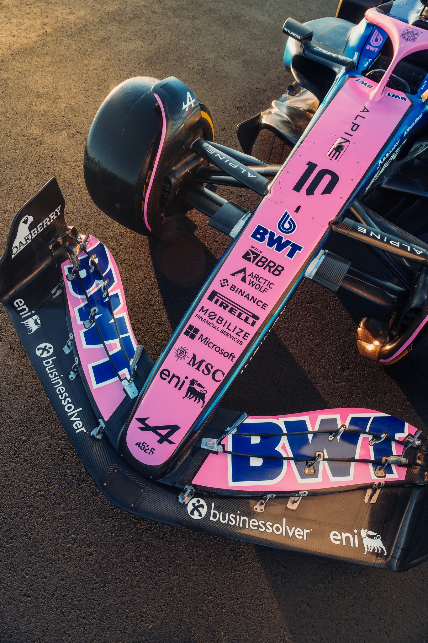 Beaucoup moins de noir cette année, l’A525 est au poids visiblement ! Trêve de plaisanterie, le rose est devenu très présent aux côtés du bleu, sur une monoplace qui arbore ses nouveaux sponsors récemment dévoilés, dont ENI et MSC Croisières. Sans suprise, Eni est en blanc, il ne fallait pas s’attendre au chien à six pattes noir sur fond jaune. De profil, l’assortiment bleu et rose passe assez bien, mais le museau est totalement rose, ce qui donne l’impression, en se mettant de face, de regarder une Force India.