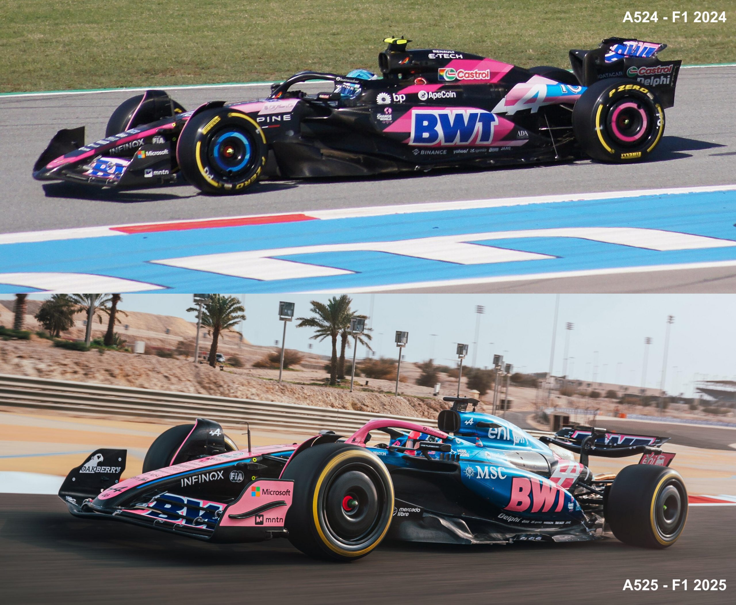 Alpine continue sur son concept et ne change pas pour des ouvertures verticales comme Red Bull ou Mercedes. A l’avant, le museau est plus court en bout de course avec une attache sur le 2d plan de l’aileron. L’A524 allait jusqu’au premier plan. Le museau semble aussi plus fin, même si la livrée n’aide pas à la comparaison.