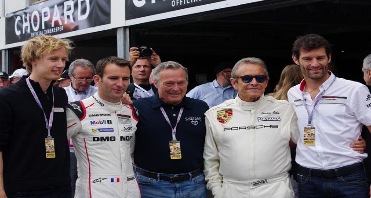 De gauche à droite Brendon Hartley, Romain Dumas, Karl-Friedrich Scheufele, PDG des montres Chopard, Jacky Ickx et Mark Webber.