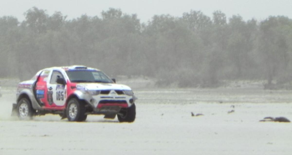 Après l’unique bivouac en rase campagne, le Taklimakan Rally s’offre une dernière grosse étape (253km de spéciale.) Les concurrents partent des dunes de la montagne de Mazartag (NDLA : ce n’est qu’un nom; il n’y a pas de montagne dans cette plaine), avec son dédale de pistes. D’ailleurs, le vainqueur de la veille, Liu Yangui (Zotye), se perd. Les autres préfèrent suivre Han Wei (buggy SMG.) Puis le tracé débouche sur le lit d’un fleuve asséché. Sur le sable immaculé, le rallye à des airs de salars sud-Américain. Cela donne une belle arrivée au sprint.